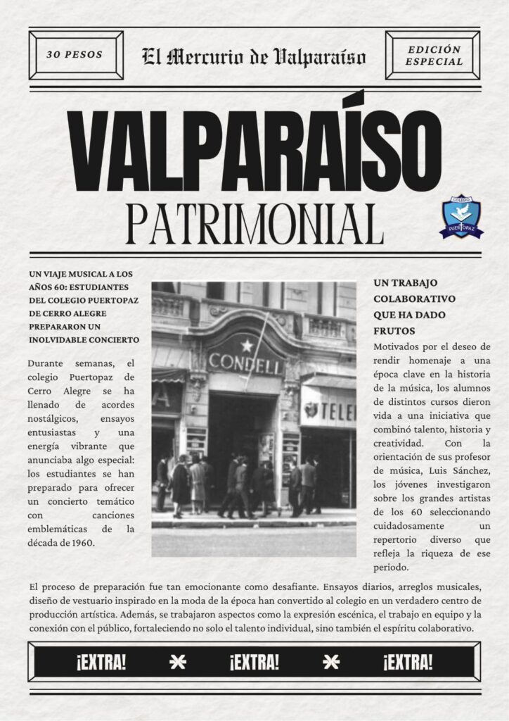 El pasado miércoles 11 de junio, el Teatro Municipal de Valparaíso se llenó de emoción, nostalgia y talento con el concierto “Valparaíso Patrimonial”, una inolvidable presentación organizada por nuestro colegio. En esta ocasión, todos los cursos —desde 1° básico hasta 4° medio— participaron con entusiasmo en un homenaje musical a una década que marcó profundamente la historia cultural y social de nuestro país y del mundo.